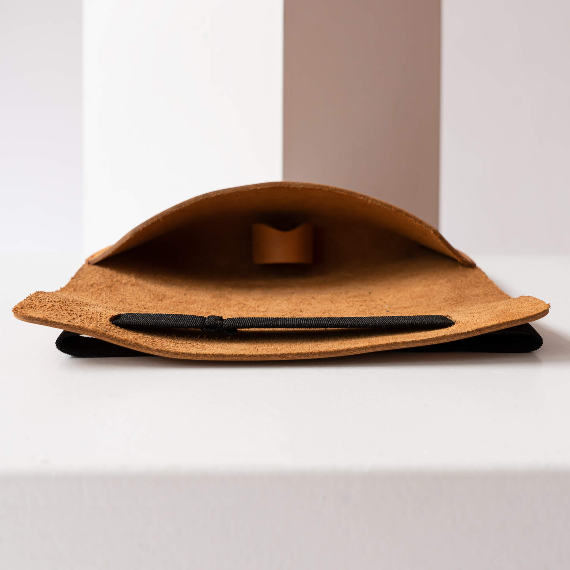Brillenetui LUK in Hellbraun mit schwarzem Verschlussband aufgeklappt